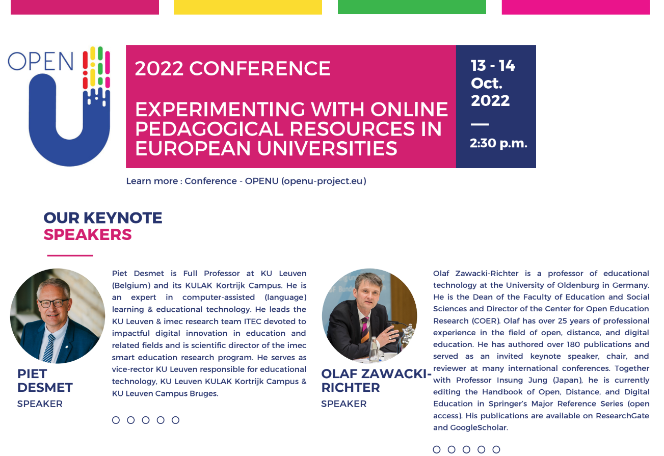 The Universities of Rennes 1 and Paris 1 Panthéon-Sorbonne are delighted to invite you to the OpenU International Conference “Experimenting with Online Pedagogical Resources for European Universities”, which will take place in Paris, France, on October 13th (afternoon) and 14th (all day), 2022.